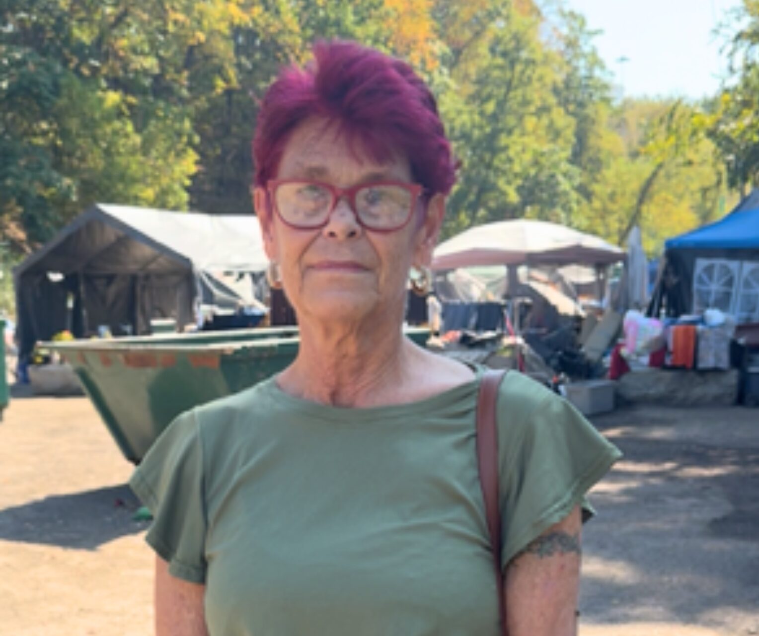 At the camp, we saw two rows of tents with clothing, bicycles and trash strewn about. We saw several Kroger shopping carts and a table filled with hanging baskets of flowers. There were portable toilets provided by the city which Dittmar says are not always cleaned. She opened the stalls and checked them and said they were in better condition that day. There were just about a dozen people at the camp that afternoon. We also saw a baby stroller but a woman at the camp said no children were there. Dittmar says children have been in the camp but social services authorities took them into custody.