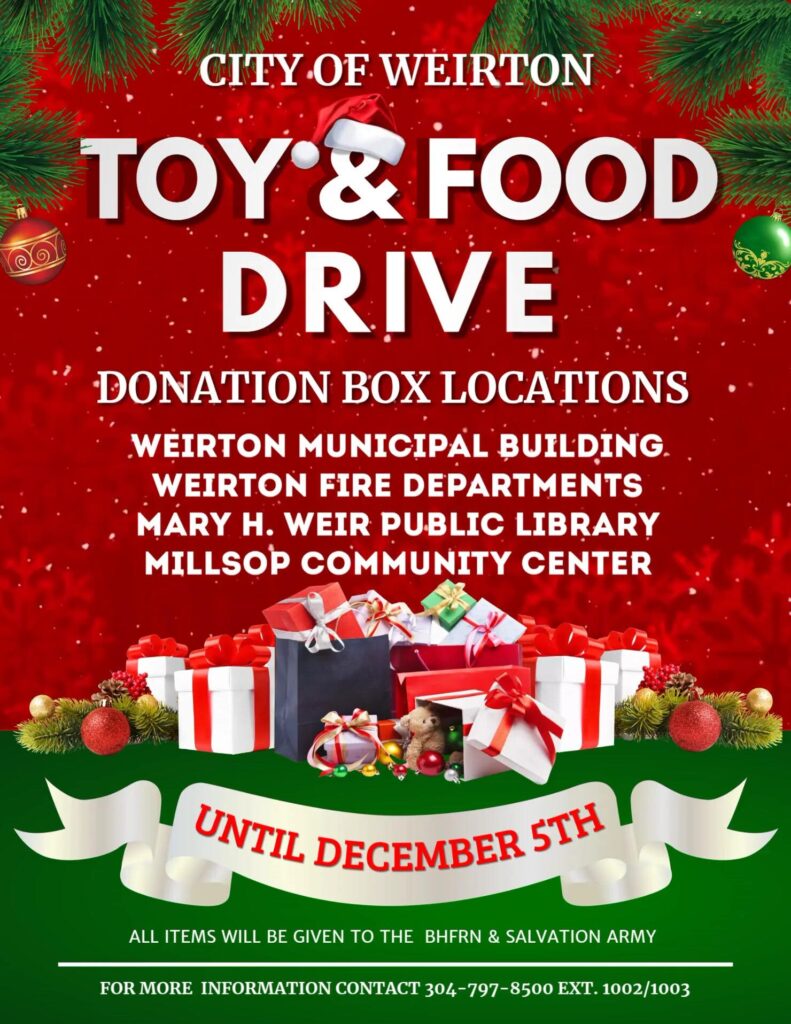 West VirginiaBrooke CountyHancock CountyHolidaysLocal newsOhio ValleyWeirton Weirton Sponsoring Food and Toy Drive By River News Network Staff - November 7, 2025 0 FacebookTwitter WEIRTON, W.Va. – The City of Weirton is sponsoring a toy and food drive through Dec. 5. Donation box locations are placed throughout the city. See the flyer below for details.