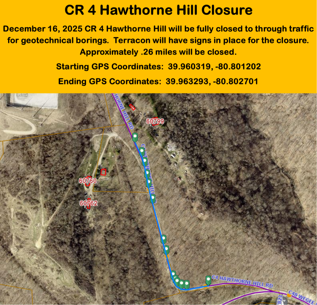 BELMONT COUNTY, Ohio – The Belmont County Engineer’s Office reports that Hawthorne Hill will be closed Dec. 16.