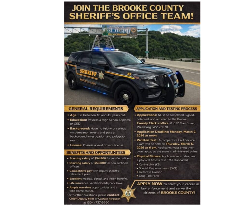 BROOKE COUNTY, W.Va. — The Brooke County Sheriff’s Office plans to hire new deputies in the coming months to strengthen public safety.
