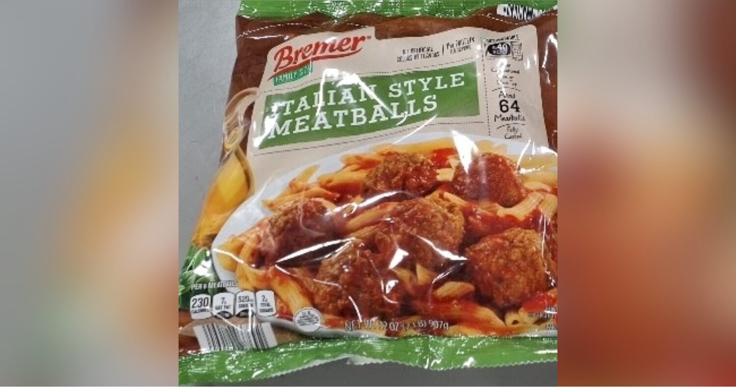 The affected product is 32-ounce bags of Bremer Family Style Italian Style Meatballs with a best-by date of October 30, 2026, and time stamps between 17:08 and 18:20 printed on the label. The meatballs were produced on July 30, 2025, and packages contain approximately 64 meatballs. The packaging also displays establishment number EST. 4286B.