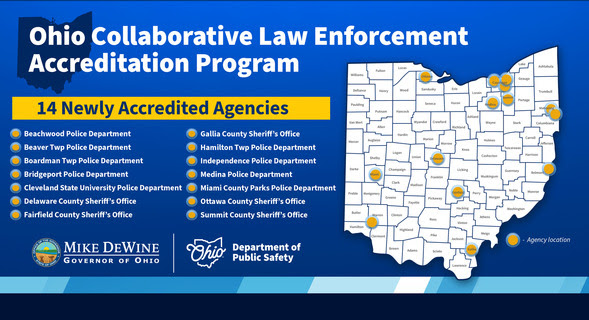 “Attaining accreditation through this program is a prestigious achievement,” said Governor DeWine. “Those living in communities served by an accredited department can be confident that their local law enforcement agency demonstrates exceptional professionalism and meets Ohio’s high expectations for excellence in public safety services.”